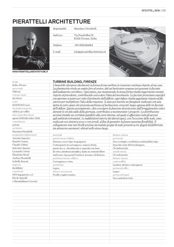 AWW INTERNI 2013 AWW INTERNI 2013 AWW INTERNI 2013. In occasione del catalogo riguardante i 100 migliori progetti del 2013. Redatto dalla rivista INTERNI Pierattelli Architetture viene selezionato con GE Turbine Building e Fosso Bandito. Tags: architetto a Firenze, architetto Firenze, architetto massimo, architetto pierattelli, fosso bandito, GE Turbine Building, Interni, interni italia, massimo pierattelli, rivista interni, top 100