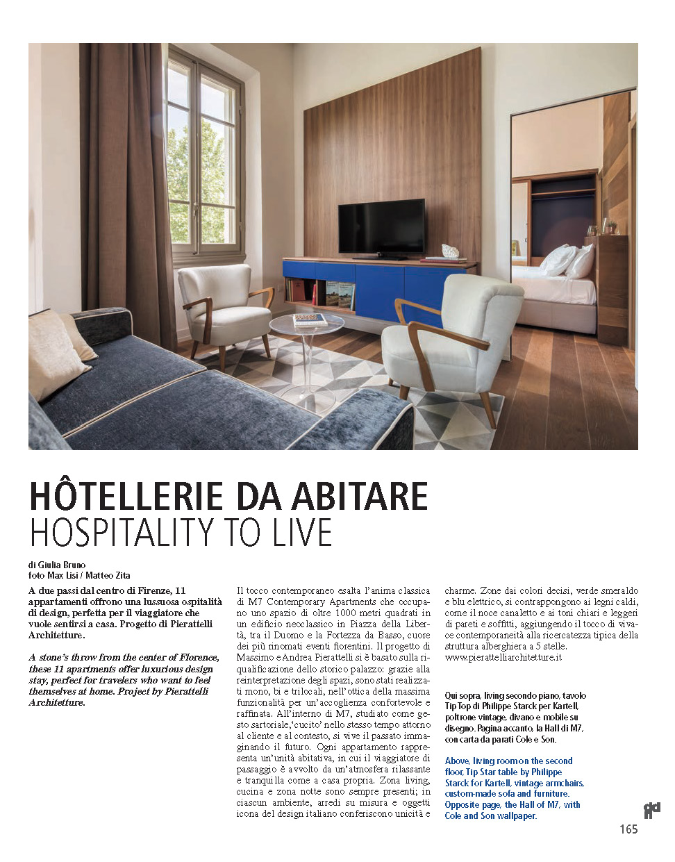 A STONE’S THROW FROM THE CENTER OF FLORENCE, THESE 11 APARTMENTS OFFER LUXURIOUS DESIGN STAY, PERFECT FOR TRAVELERS WHO WANT TO FELL THEMSELVES AT HOME | A contemporary touch enhances the classic soul of M7 Contemporary Apartments on a space of over 1000 square meters in a neoclassical building on Piazza della Libertà, between the Duomo and the Fortezza da Basso, the heart of the most renowned Florence events. The project by Massimo and Andrea Pierattelli was based on the redevelopment of the historic building: thanks to the reinterpretation of the spaces, they created one, two and three-room apartments, focused on great functionality for a comfortable and refined stay. Inside M7, which is studied up to the smallest detail, ‘tailored’ to both the customer and the context, you live the past imagining the future. Each apartment features a living unit, in which the passing traveler is enveloped in a relaxing and peaceful home-like atmosphere. The apartment includes a living area, kitchen and sleeping area; in each room, bespoke furnishings and Italian design icons make the space unique and charming. Space characterized by bright colors such as emerald green and electric blue, make a contrast with the warm woods, such as Canaletto walnut and light tones of walls and ceilings, adding a lively and contemporary touch to the typical refinement of a 5-star hotel.