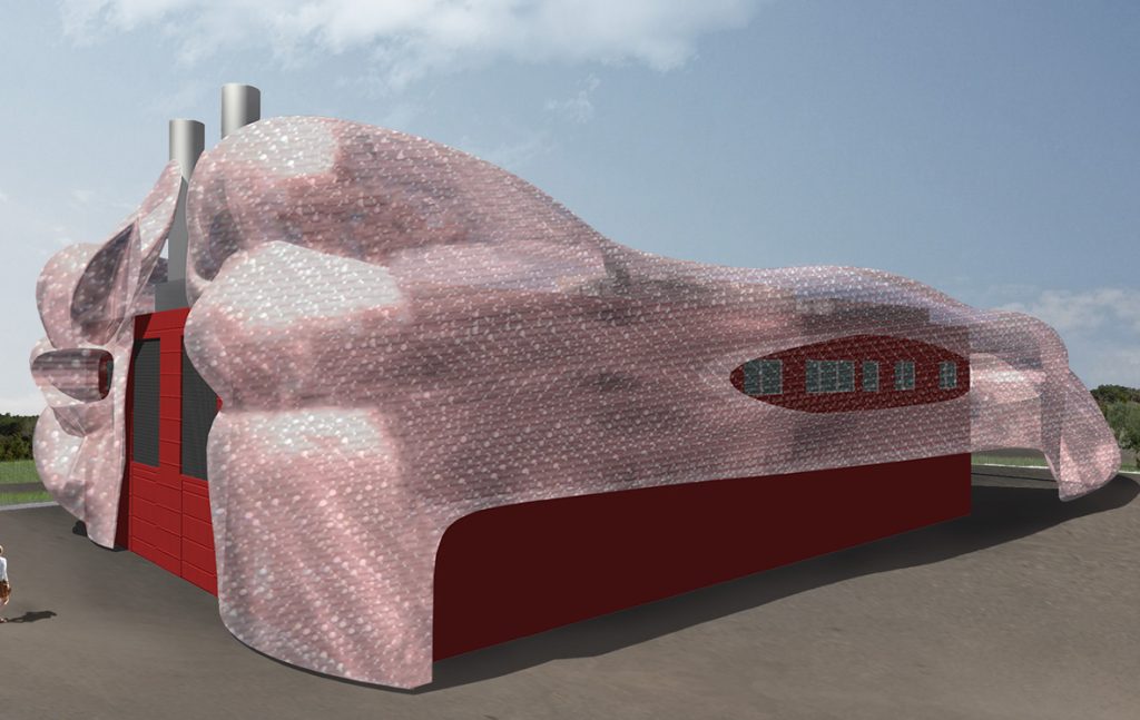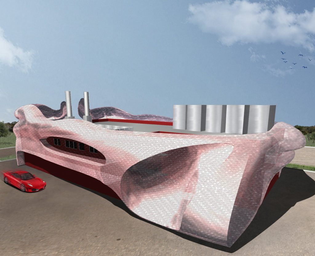 Ferrari motor is represented by a trigeneration equipment and its energy contributes to realize the most beautiful and powerful cars in the world.For this reason the project became a sculpture-building, wrapped in a particular steel material, to impress on the surface the Ferrari soul, and plastic, aerodynamic, sinuous forms had been realised to communicate a sensation of power and movement. In this building car-details became architectural elements: the frontal part looks like the front of a F1 car; the sides, on which ventilation shaft are reproduced, are channelling refreshing air for the motor; the final part reproduces exhaust manifold that rise to the chimneys.