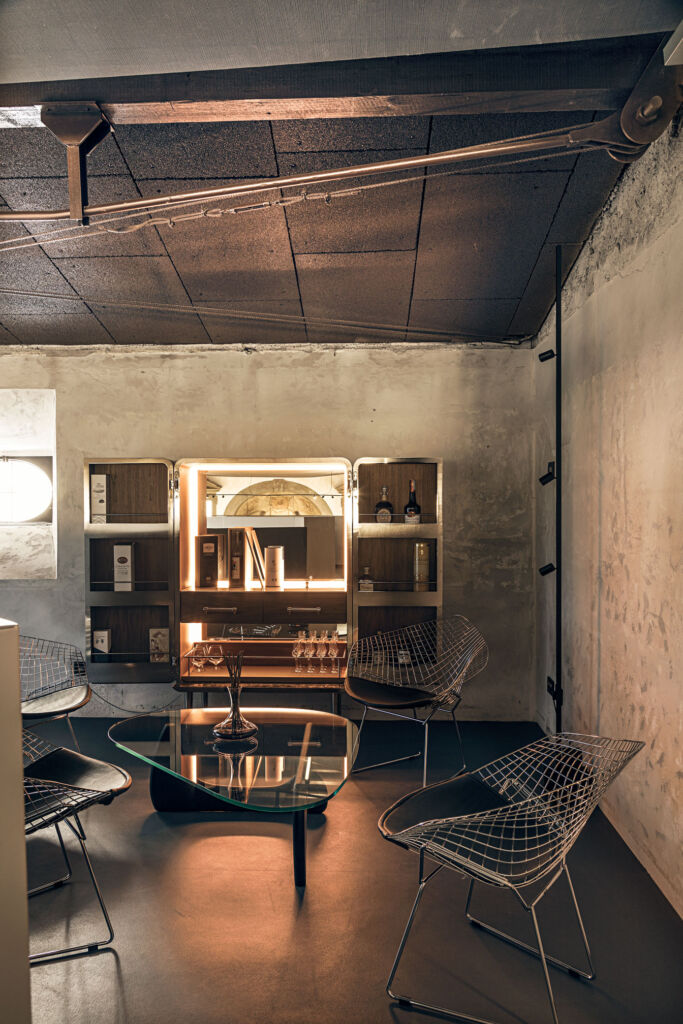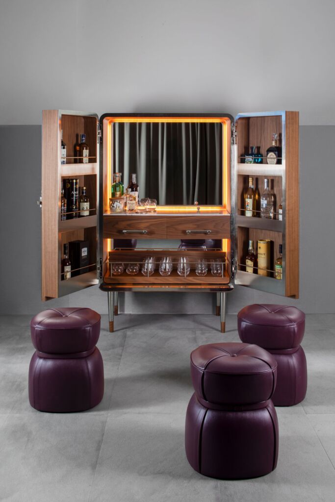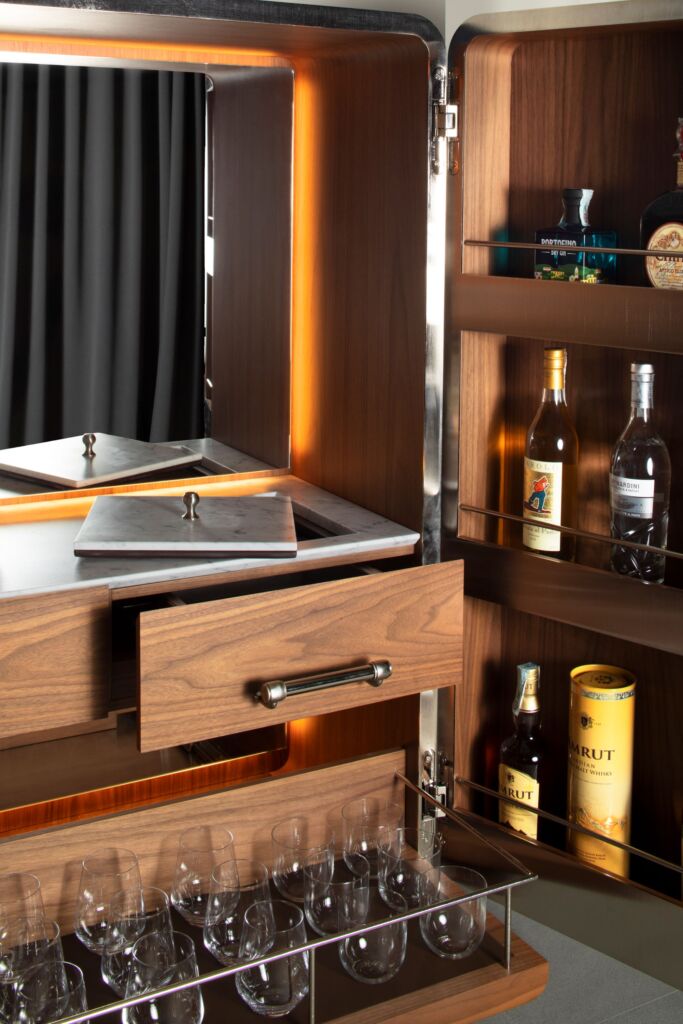 The project includes a highly functional internal structure designed to guarantee an intuitive user experience. The central body is organized with precision, including a pull-out shelf covered in eco-leather to store glasses and two upper drawers: one dedicated to cocktail preparation utensils and the other that conceals a pull-out ice tray, made entirely of steel. A detail that reflects the studio’s attention to the perfect balance between aesthetics and practicality.