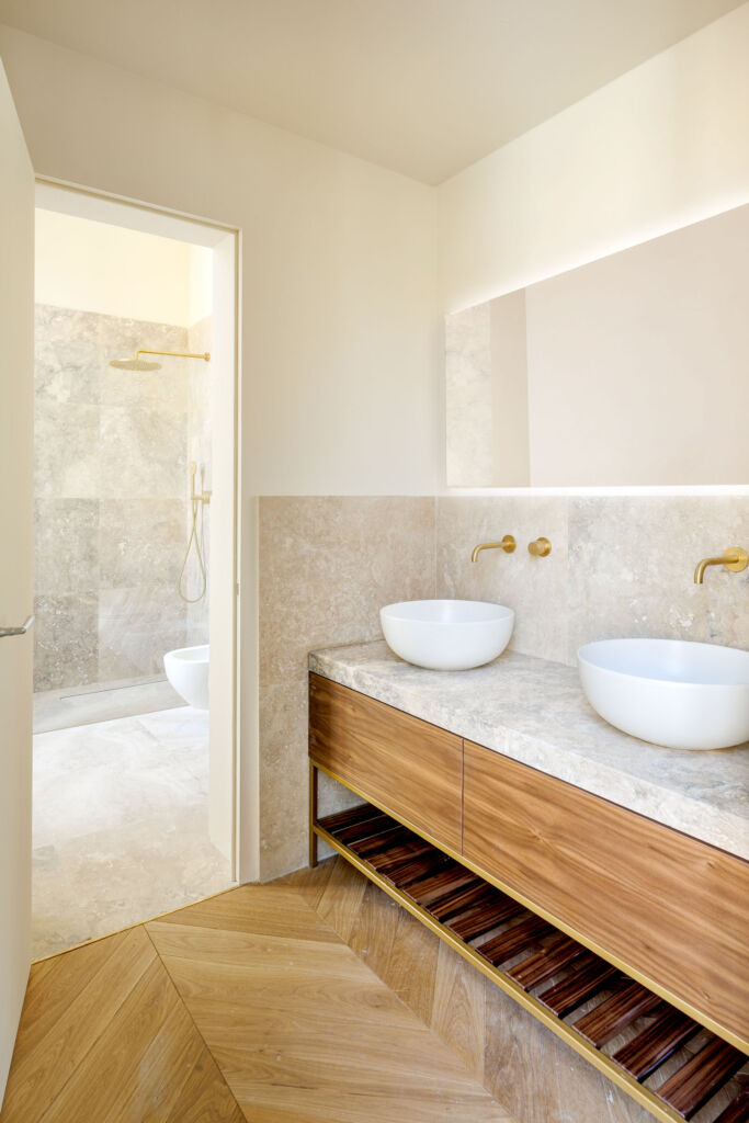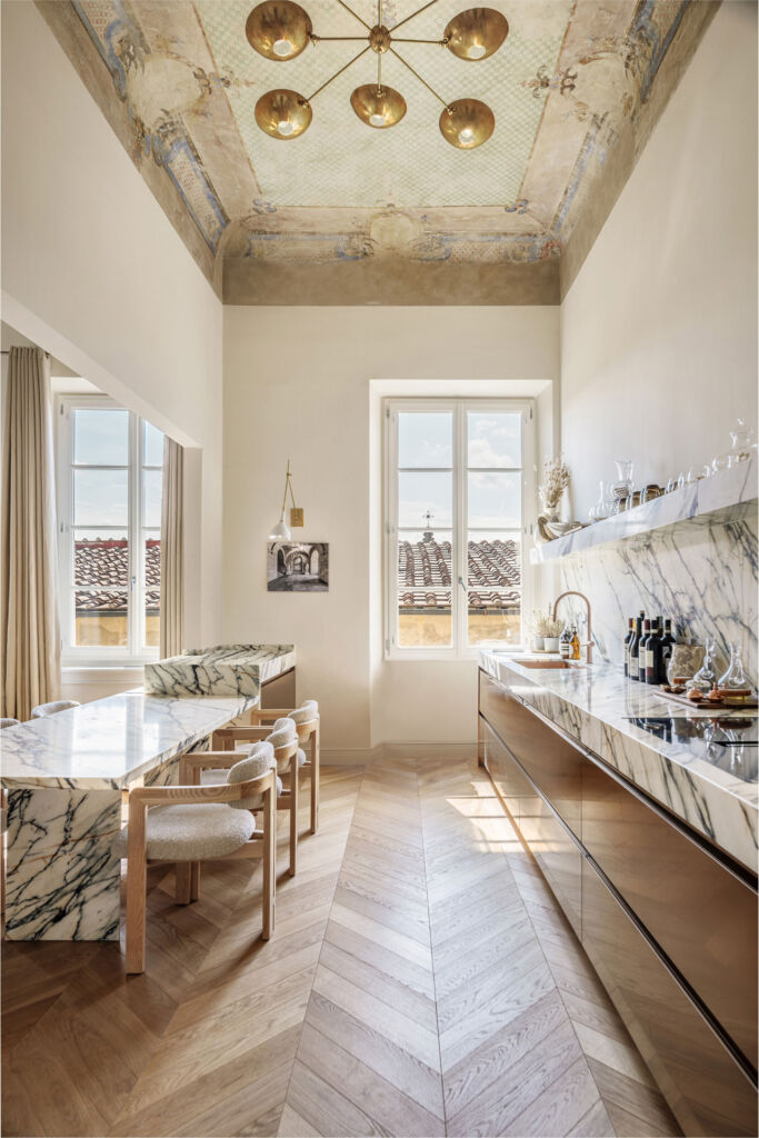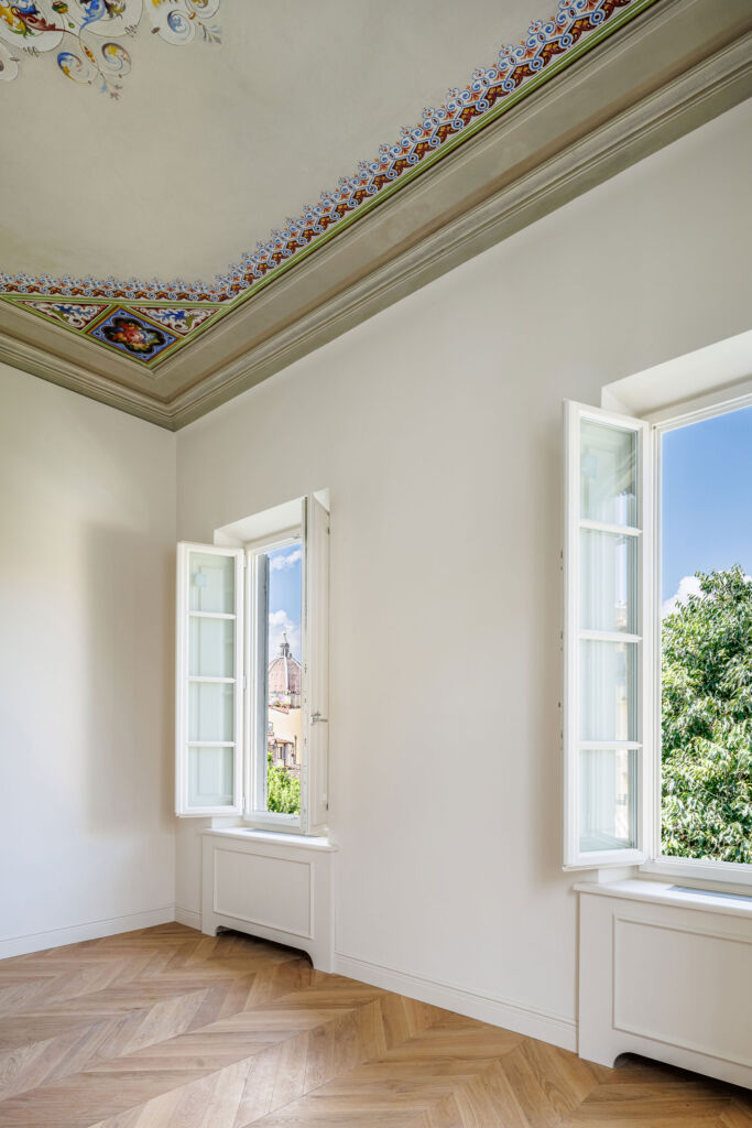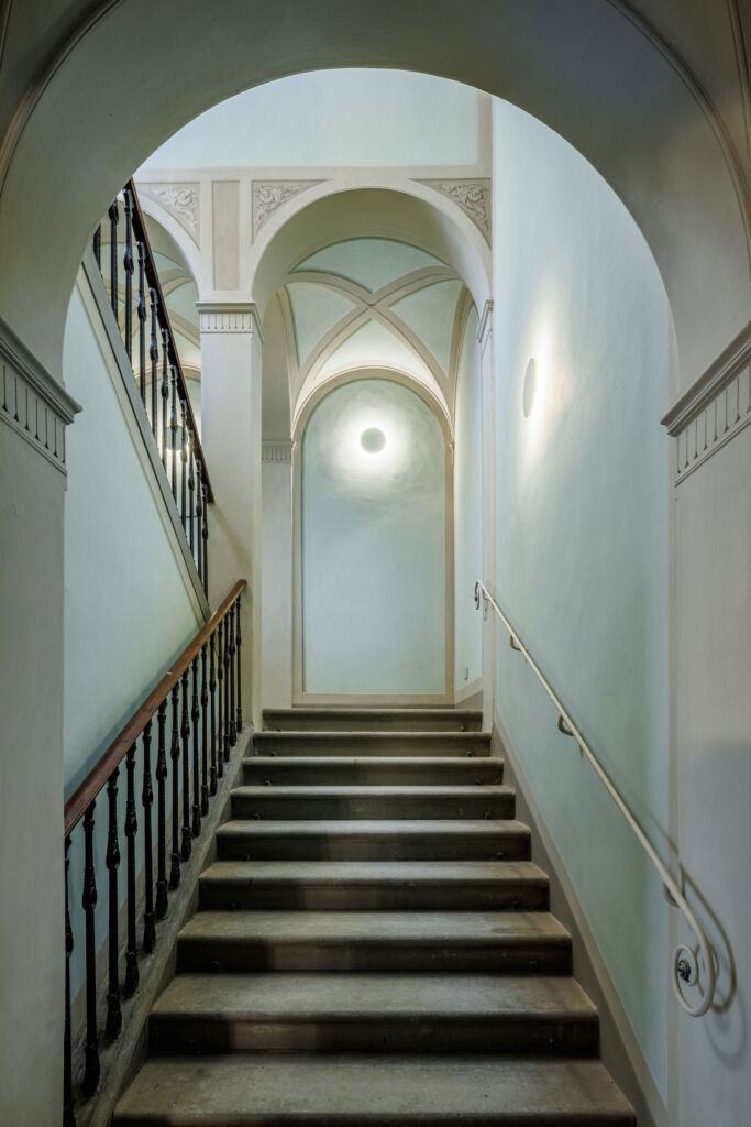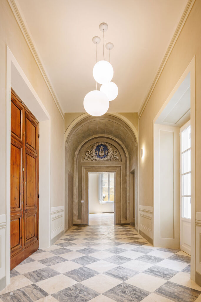 Il progetto di ristrutturazione è stato pensato per esaltare la storicità e la tradizione del luogo: alcuni elementi strutturali originali, come travi e capriate, sono state restaurati e ripristinati, così come numerosi affreschi che decorano i soffitti. Ad affiancare questi elementi fortemente caratterizzanti, arredi contemporanei e reinterpretazioni in chiave moderna di caratteri classici. Il letto della camera padronale è stato progettato su misura: la testata in tessuto, enfatizzata da una scenografica parete a listelli in legno di Noce Canaletto, contribuisce a creare un ambiente caldo e accogliente. Per la pavimentazione è stato scelto un pregiato parquet a spina ungherese in Rovere, utilizzato anche nelle zone giorno degli appartamenti.