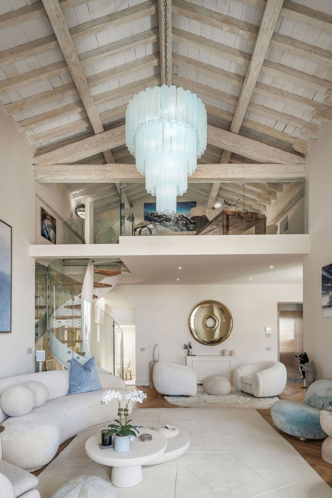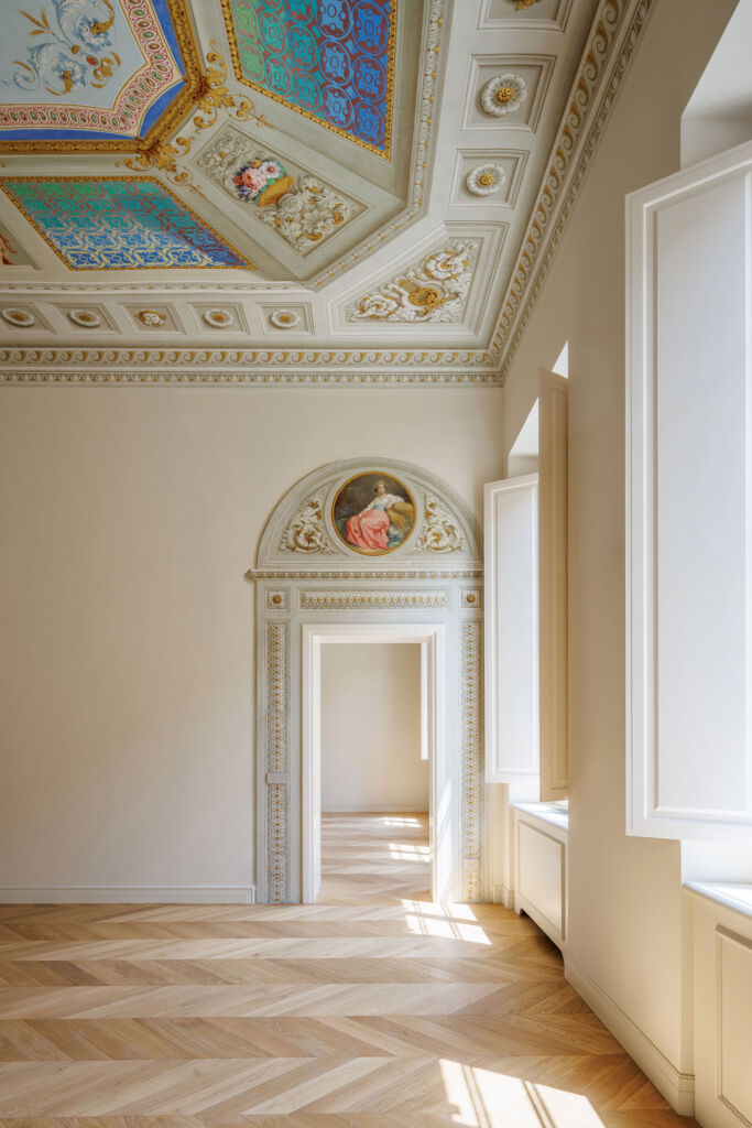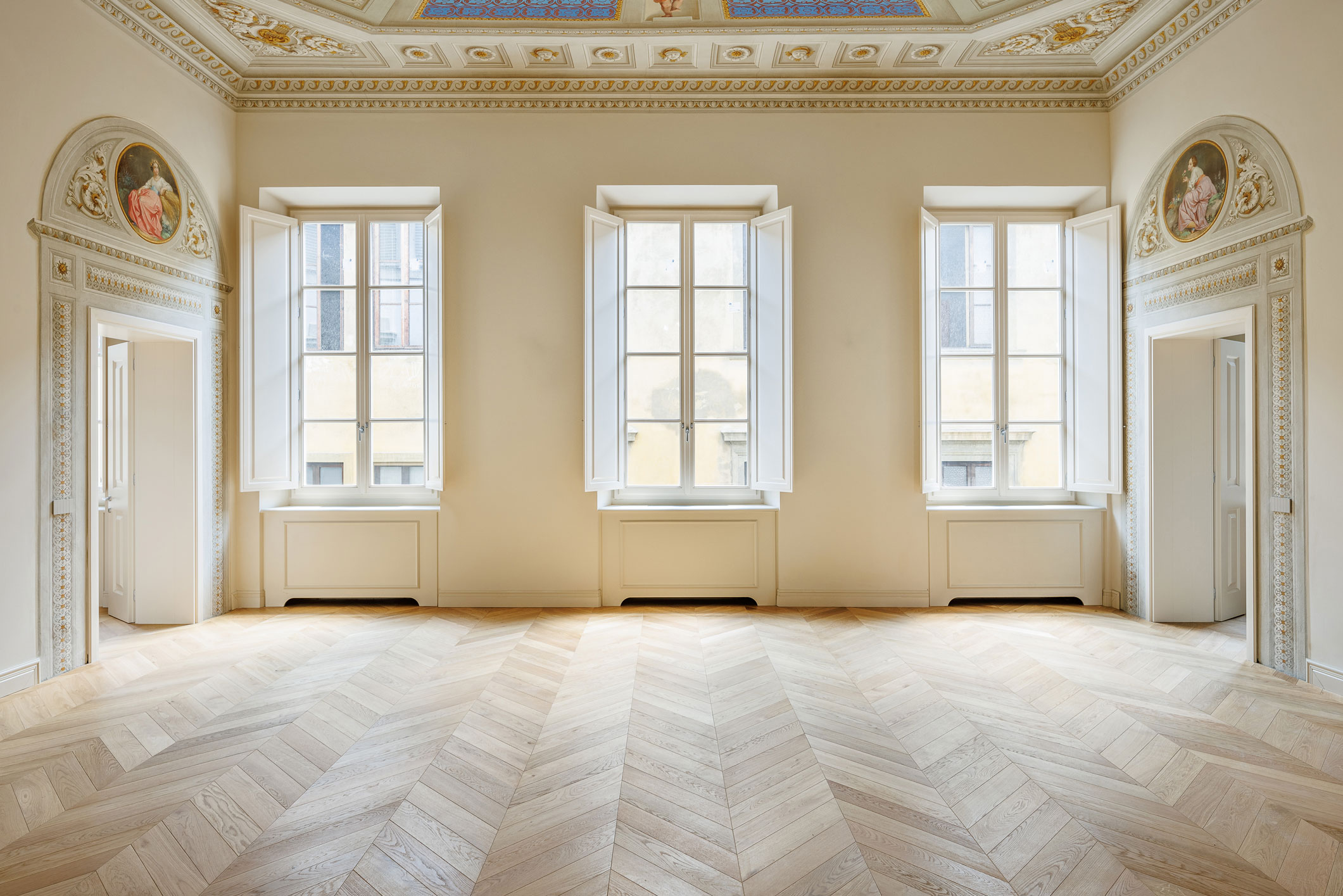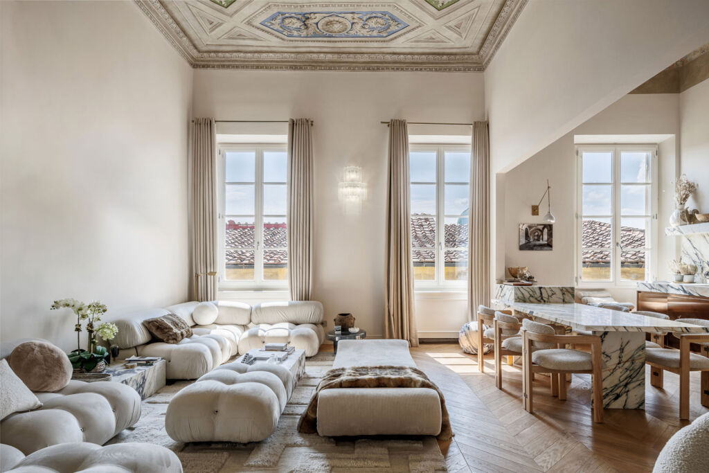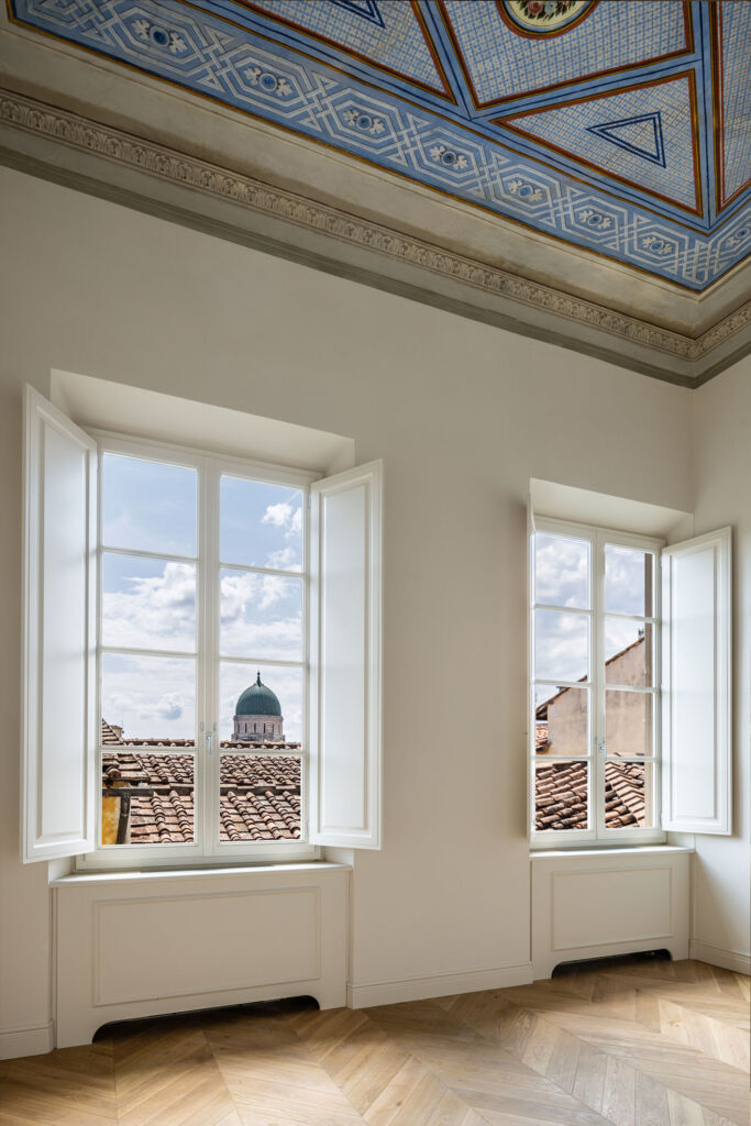 Il progetto di ristrutturazione è stato pensato per esaltare la storicità e la tradizione del luogo: alcuni elementi strutturali originali, come travi e capriate, sono state restaurati e ripristinati, così come numerosi affreschi che decorano i soffitti. Ad affiancare questi elementi fortemente caratterizzanti, arredi contemporanei e reinterpretazioni in chiave moderna di caratteri classici. Il letto della camera padronale è stato progettato su misura: la testata in tessuto, enfatizzata da una scenografica parete a listelli in legno di Noce Canaletto, contribuisce a creare un ambiente caldo e accogliente. Per la pavimentazione è stato scelto un pregiato parquet a spina ungherese in Rovere, utilizzato anche nelle zone giorno degli appartamenti.