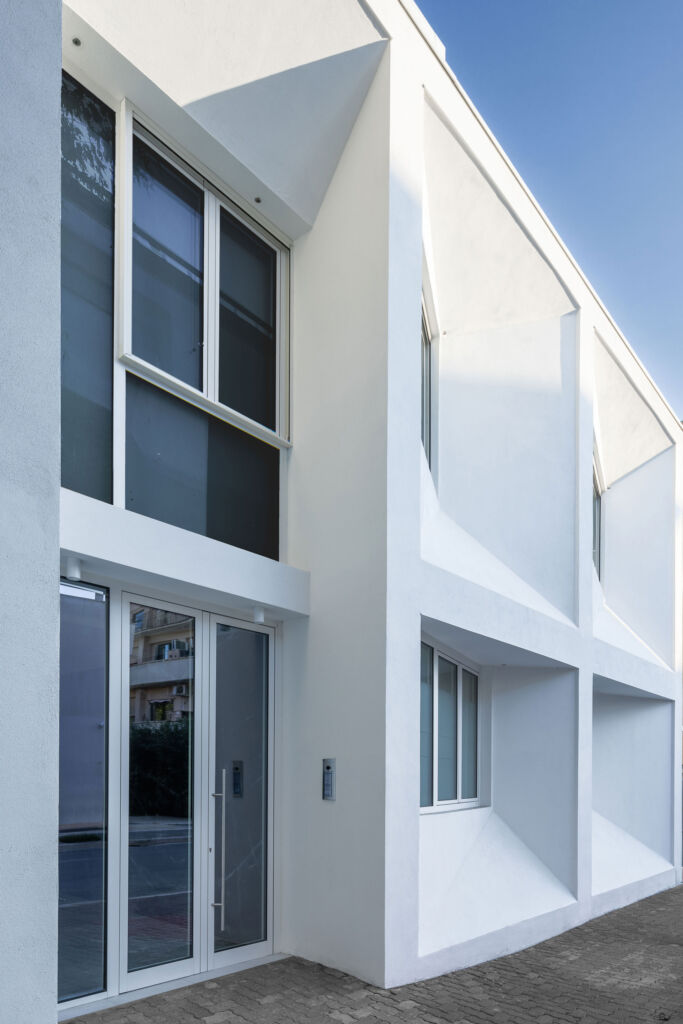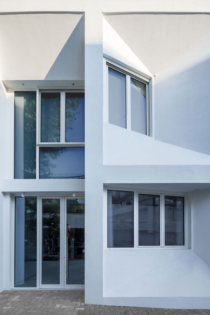 I due volumi originali sono stati uniti in una zona centrale comune, adibita ad ingresso e area distributiva, il corpo del vano scale incorniciato in un parallelepipedo di listoni lignei blu che, in contrasto con il bianco dell’edificio, diventa elemento identificativo oltre che funzionale.
