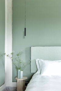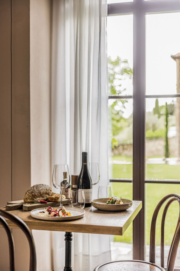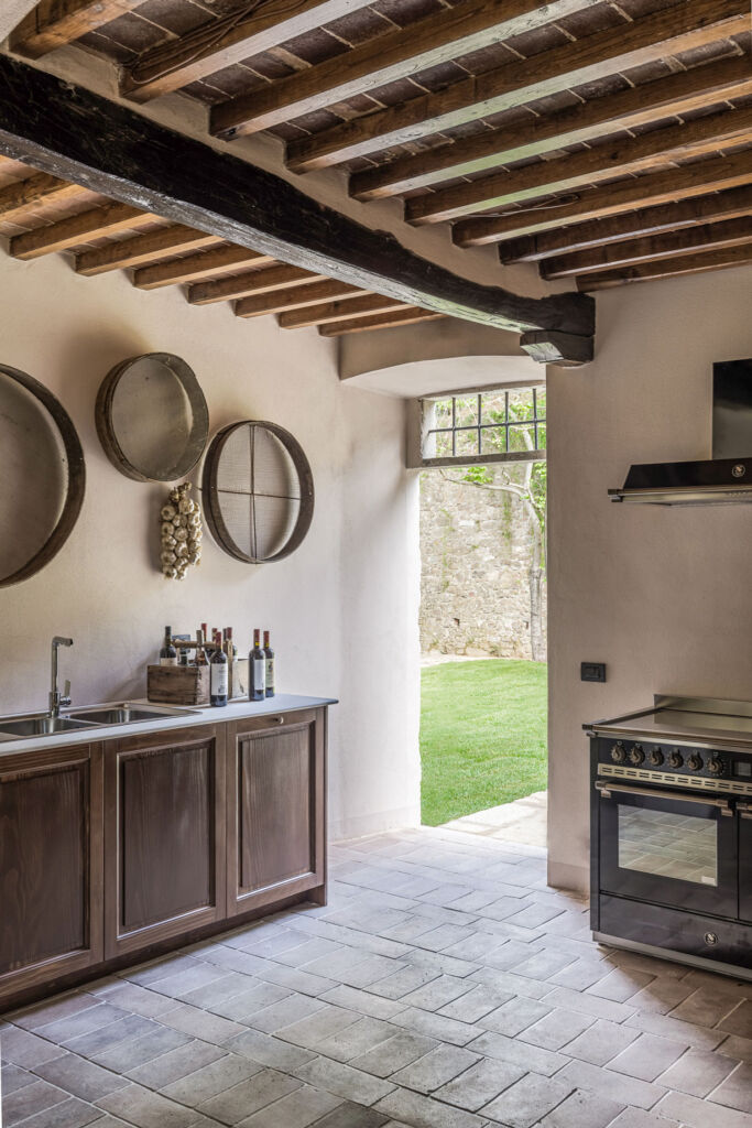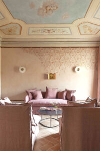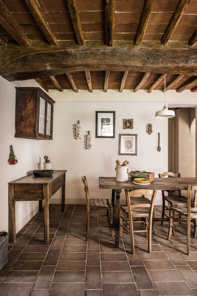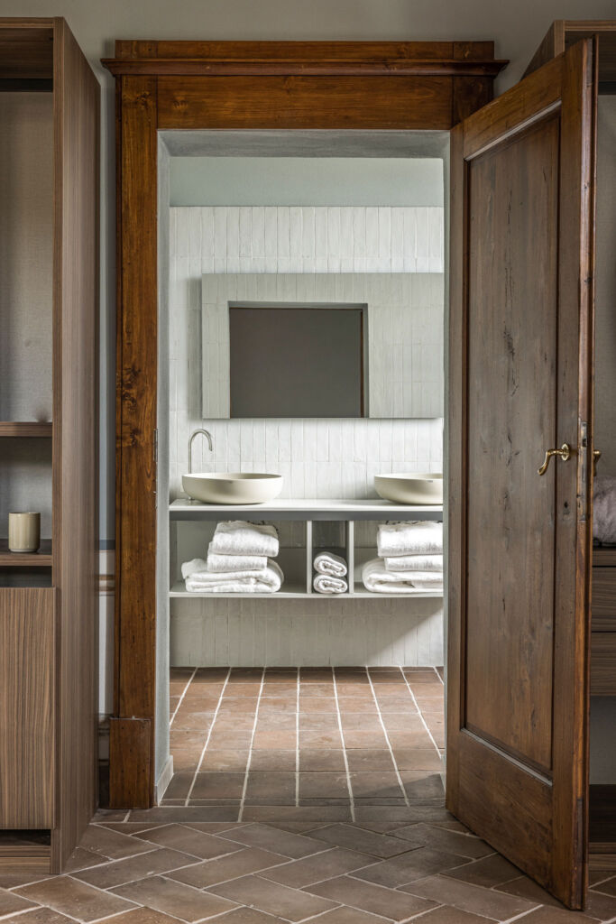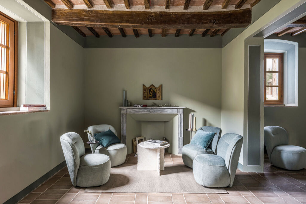 Negli interni purezza stilistica e gusto contemporaneo vanno di pari passo con la scelta di arredi sobri e dalle linee pulite di Gervasoni, con una predilezione per i colori della terra, come il verde salvia, oltre a variazioni di beige, bianco e marrone, e con materiali propri del territorio, come il cotto per i pavimenti di Cotto Manetti, l’intonaco di calce per le pareti, il legno per gli infissi e i battiscopa dipinti: archetipi preservati dell’architettura rurale toscana. Alle pareti donano un tocco sofisticato le opere dell’artista parigina Dune Varela, stampate su lastre di marmo di Carrara e gli erbari di Stéphanie Montaigu, che incolla immagini di fiori e sculture antiche sulle pagine ingiallite di vecchi libri.