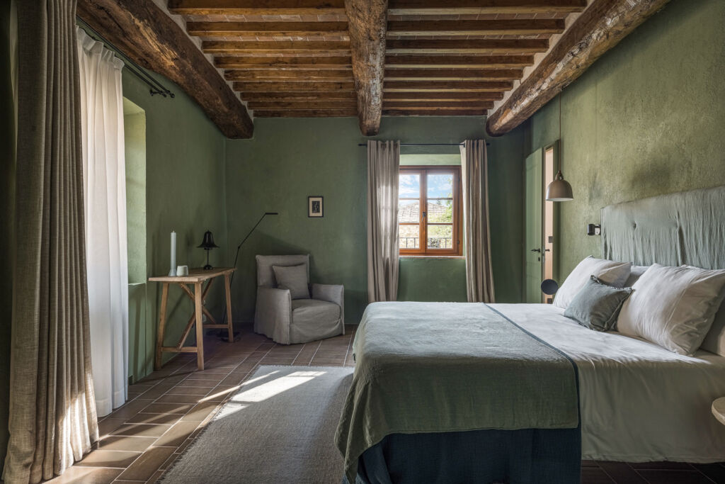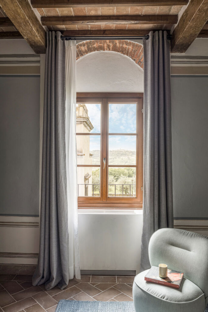 Delle tre residenze ristrutturate, in cui sono state ricavate le 22 camere del boutique hotel, l’edificio principale adiacente alla Chiesa, denominato “la Pieve”, è la porzione vincolata dalla Soprintendenza. Qui Pierattelli Architetture ha dato vita a un intervento puntuale mantenendo e restaurando le decorazioni murarie interne originali che adornano le pareti del piano nobile. Una scala in pietra conduce al primo piano, dove si trova un ampio spazio in cui il soffitto in legno a cassettoni rende ancora più calda l’atmosfera, mentre le pareti in calce naturale decorate con affreschi di stampo neoclassico donano eleganza e raffinatezza. Come “la Pieve”, anche gli altri due edifici – chiamati “Studiolo” e “Conventino” – sono arricchiti da suggestivi soffitti in legno e finestre che incorniciano il verde della campagna incontaminata.