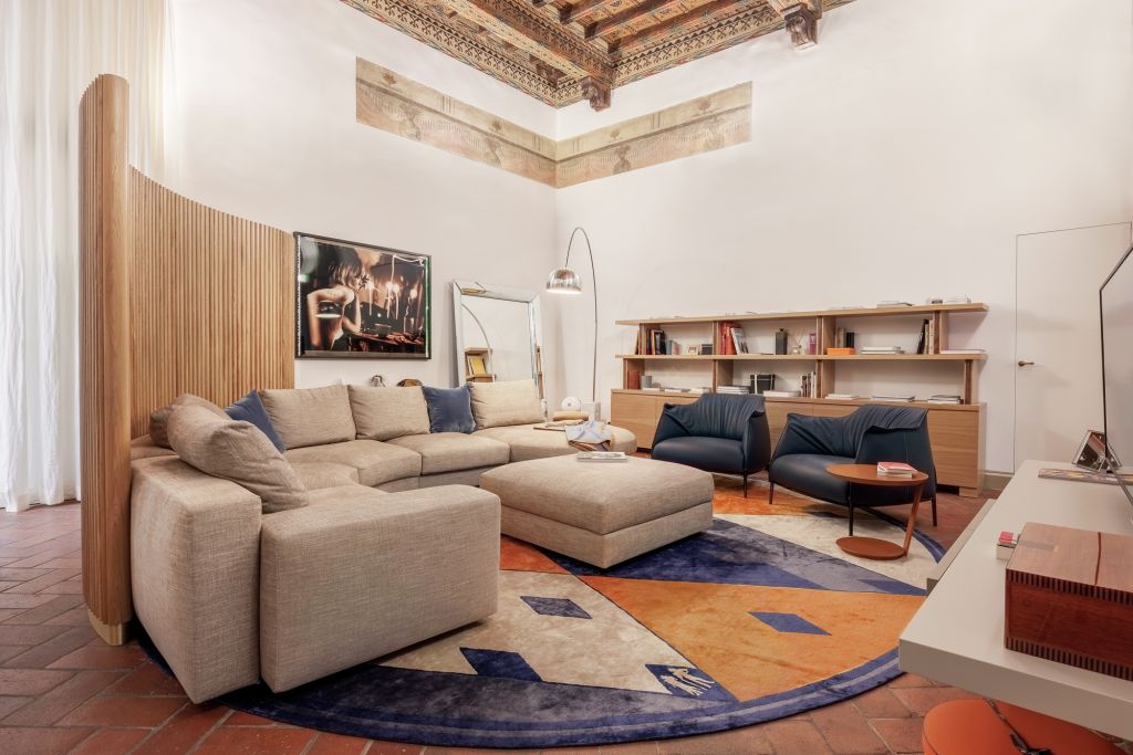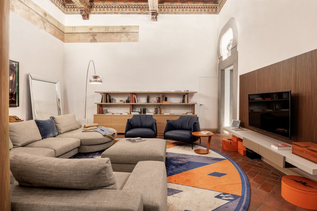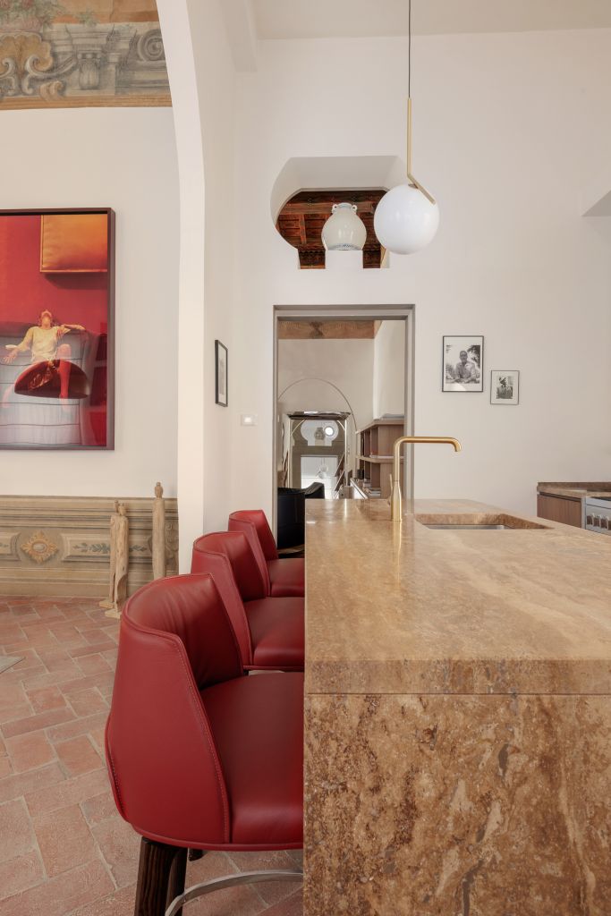 Colori caldi e decisi, soluzioni artigianali su misura e materiali naturali definiscono spazi ampi e luminosi, dove le tonalità cromatiche neutre delle pareti contrastano con le nuance dei soffitti dipinti. L’appartamento racconta una lunga storia attraverso importanti preesistenze artistiche, come i soffitti a cassettoni e gli affreschi che aggiungono valore all’intera casa. L’abitazione si caratterizza per l’ampia zona giorno, contraddistinta da un living interconnesso a cucina e sala da