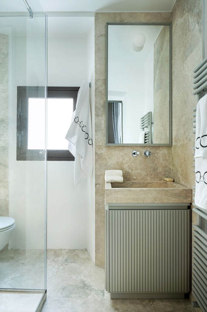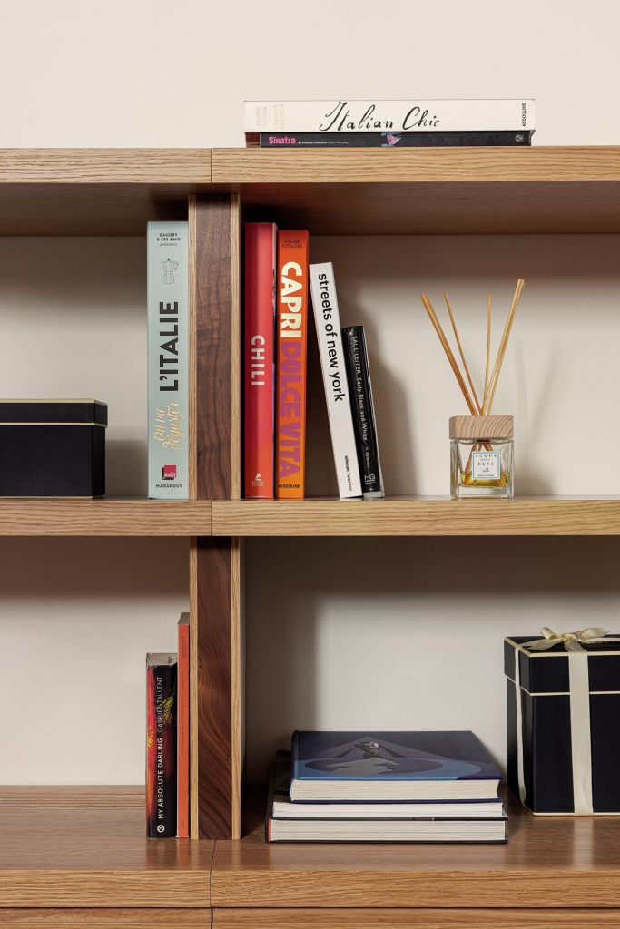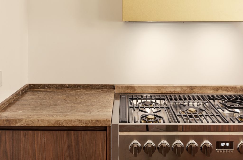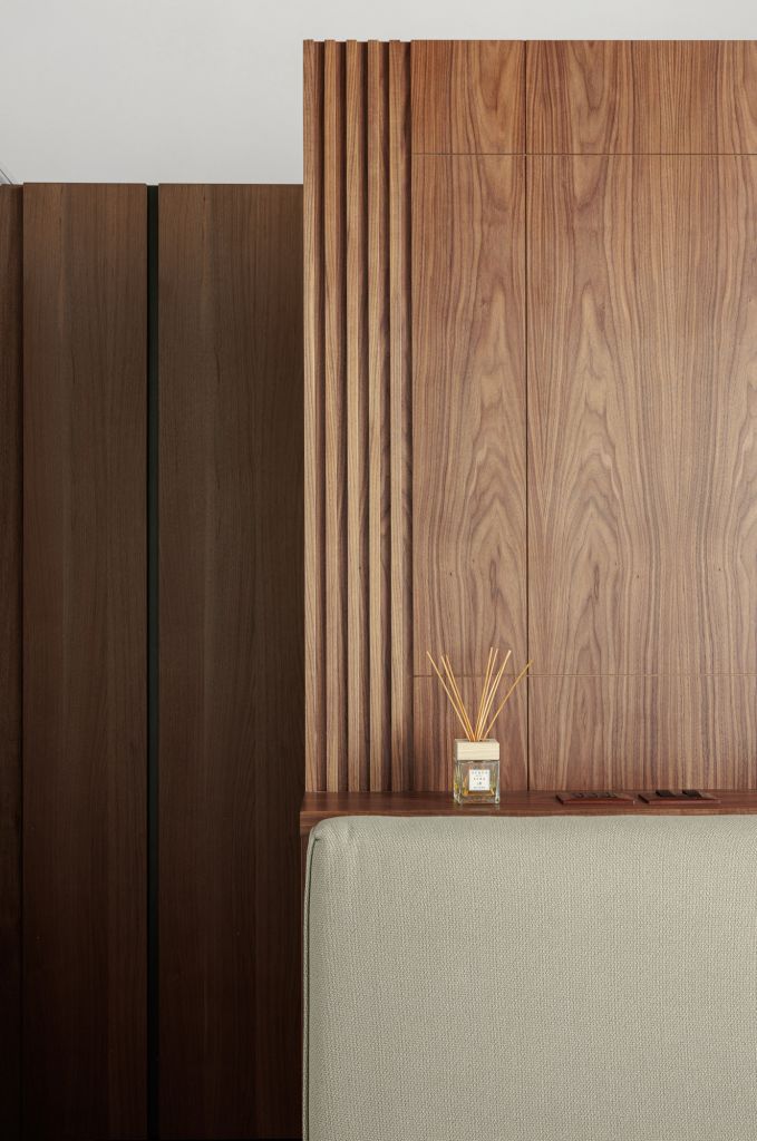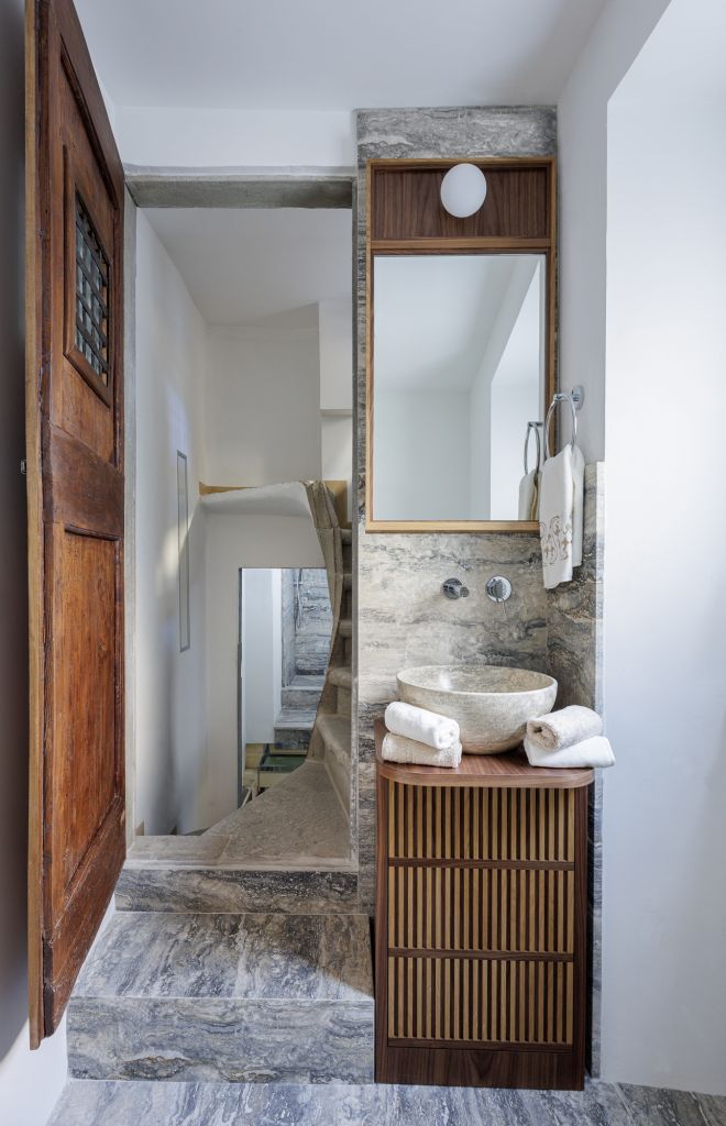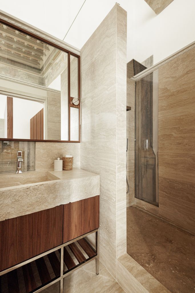 Elemento caratterizzante delle stanze da letto, una master bedroom e l’altra riservata agli ospiti, è la testiera in noce canaletto disegnata da Pierattelli Architetture che in entrambe separa la zona notte da uno spazio guardaroba con cassettiera funzionale. Completano l’appartamento uno studio e due bagni che utilizzano diverse tipologie di travertino – classico per il bagno master e moonlight blu per il bagno ospiti – completamente ristrutturati dagli architetti. Un bagno turco è situato al secondo livello, a cui si può accedere attraverso una scala a chiocciola in pietra serena, elemento originale dell’appartamento.